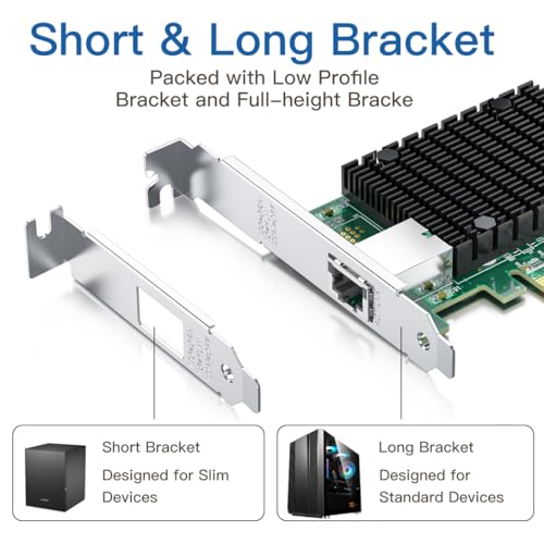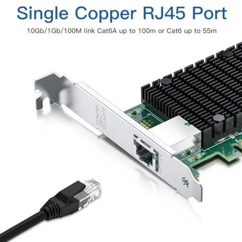 ✅10Gbase-T PCI-E NIC: 10Gb Single RJ45 Ports link Category-6A up to 100m(328 Ft) or Category-6 up to 55m(180 Ft). PCI Express 3.0 (8.0GT/s) X4 Lane, compatible with PCIE X4, X8, X16 Slot.