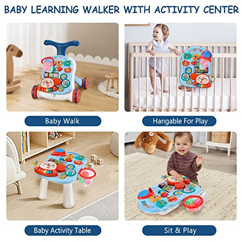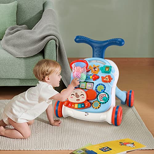 2 in 1 Lauflernhilfe zum Sitzen und Stehen für Baby, Regulierbarer Geschwindigkeit Laufwagen für Kleinkinder, Abnehmbare Spielplatte, Baby Musik Lernen Spielzeug-Für Kinder von 12-36 Monaten(Blau)