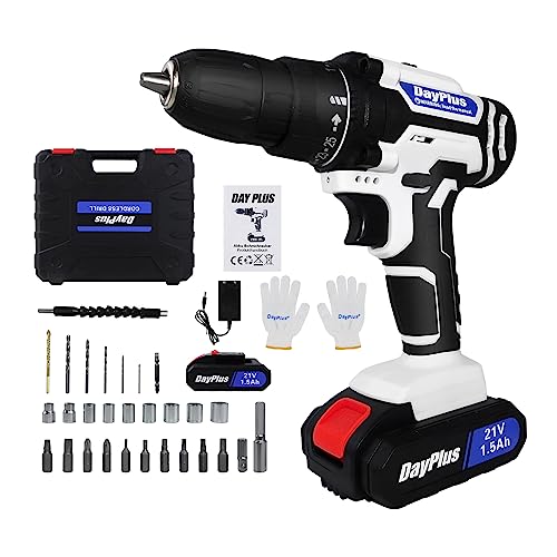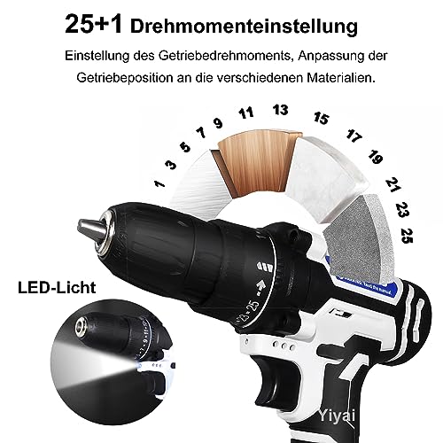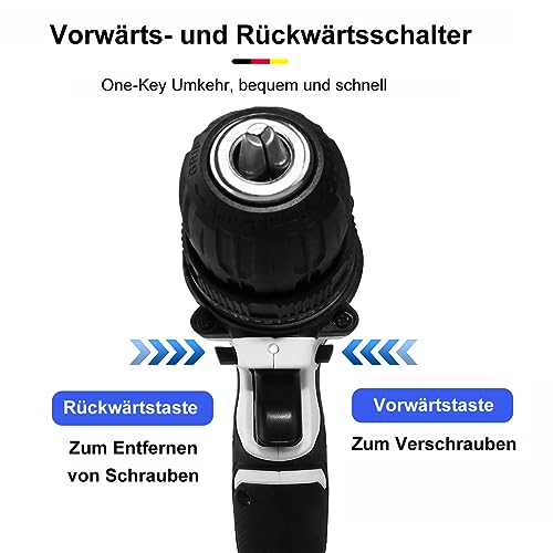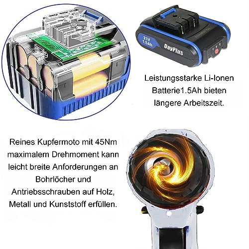 ✅ 45 Nm Bohrmaschinen Set – 21V Akku-Bohrschrauber mit 25 + 1 verschiedenen Drehmomenteinstellungen und 2 Geschwindigkeiten, es kann leicht Schrauben durch Holz (23mm maximale Bohrkapazität) und Stahl (10mm maximale Bohrkapazität), Keramikfliesen und andere Materialien bohren und schrauben.