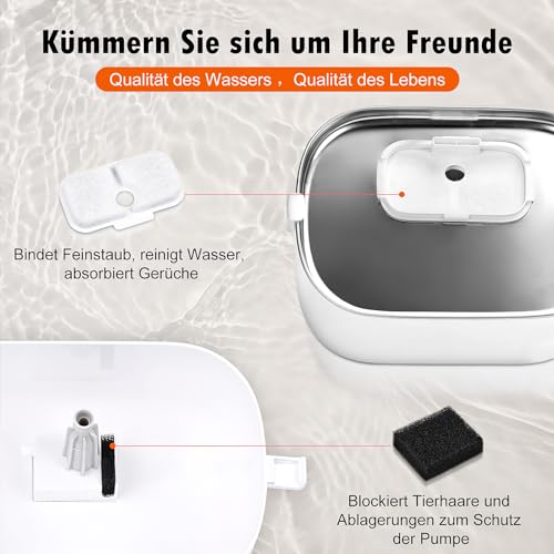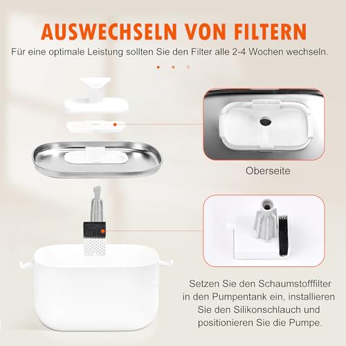 FILTERFUNKTION: Ⅰ. die Aktivkohle beseitigt Gerüche. Ⅱ. der Vliesstoff fängt Verunreinigungen und Katzenhaare auf. Ⅲ. das Ionenaustauschharz entfernt Schwermetallionen und macht das Wasser weich. Ⅳ. der eingebaute Pumpenschwamm filtert zusätzlich Verunreinigungen heraus, um Verstopfungen und Schäden zu vermeiden.
