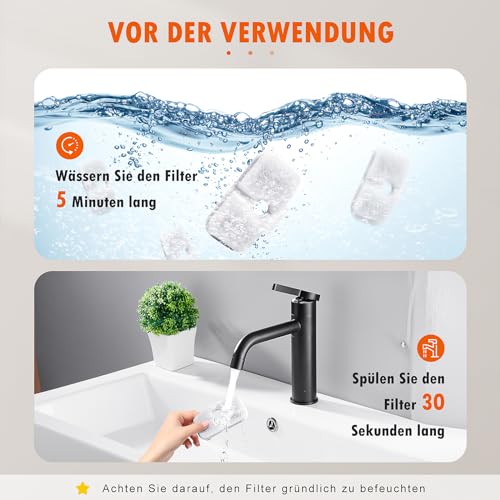 ANWENDUNG: Weichen Sie den Filter 5 Minuten lang ein und spülen Sie ihn vor dem Gebrauch 30 Sekunden lang aus. Um die Wirksamkeit des Filters aufrechtzuerhalten, wird empfohlen, den Filter alle zwei Wochen auszutauschen. Dies trägt nicht nur dazu bei, das Risiko der Aufnahme von Verunreinigungen durch Ihre Katze zu verringern, sondern hält Ihre Katze auch gesund und glücklich.