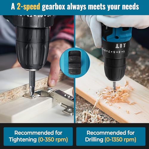 【25+3 Positionen-Kupplung】25 + 3 Drehmomenteinstellungen (0-350 U/min oder 0-1350 U/min) der Bohrmaschine können eine präzisere Drehmoment- oder Geschwindigkeitseinstellung nach Bedarf bieten, was hilft, zu verhindern, dass eine Schraube zu tief sinkt, den Kopf einer Schraube abisoliert oder sogar eine Schraubenwelle bricht.
