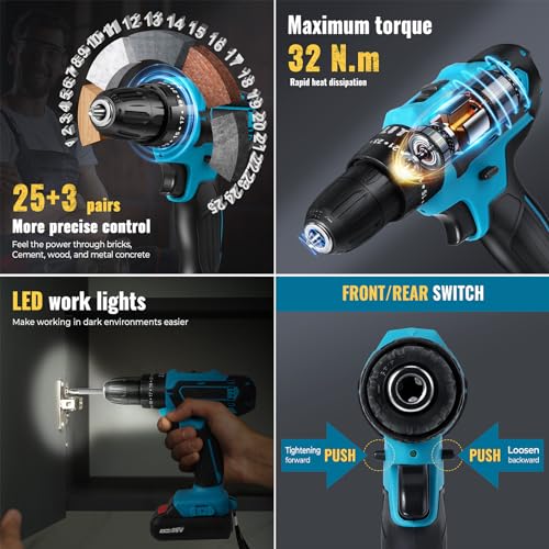 【Power Drill Set】Dieser Akku-Bohrschrauber mit überlegenem Motor, 32 Nm maximalem Drehmoment ist perfekt zum Bohren von Holz, Metall, Kunststoff und allen Schraubaufgaben zu Hause. Einstellungen bieten präzise Kontrolle für das Ein- und Ausfahren von Schrauben, um ein Abisolieren zu verhindern. Geeignet für viele andere Heimwerker- und Bastelprojekte. Es ist ein gutes ideales Geschenk für uns selbst, Familie und Freunde.