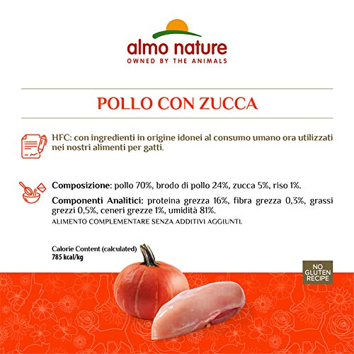 Huhn 70% Hühnerbrühe 24% Kürbis 5% Reis 1% – Analytische Bestandteile: Rohprotein 16%, Rohfaser 0,3%, Rohöle und Rohfette 0,5%, Rohasche 1%, Feuchtigkeit 81% – Nährwert 785 Kcal / Kg