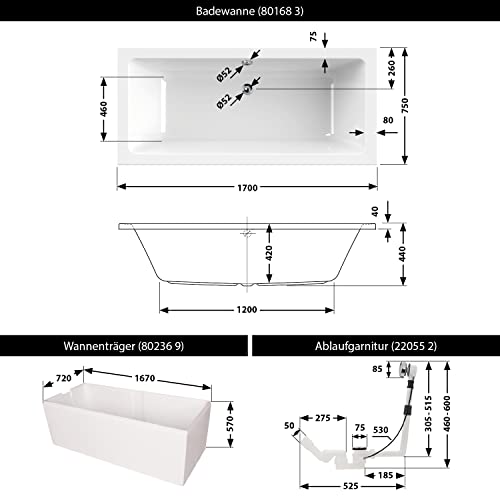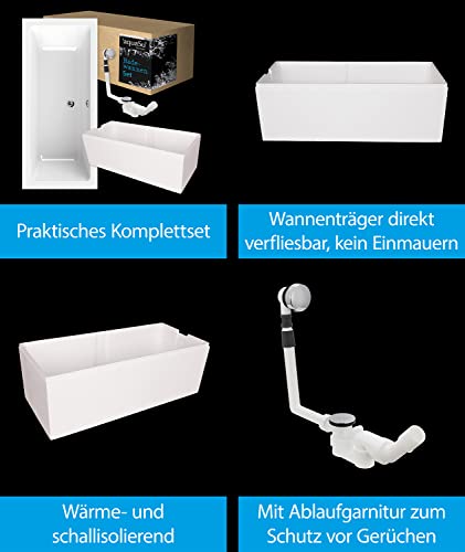➤ KOMPLETT-SET: Dieses Komplettset besteht aus einer Badewanne mit passender Excenter-Ablaufgarnitur mit Siphon und einem Wannenträger. Alles ist ideal aufeinander abgestimmt.
