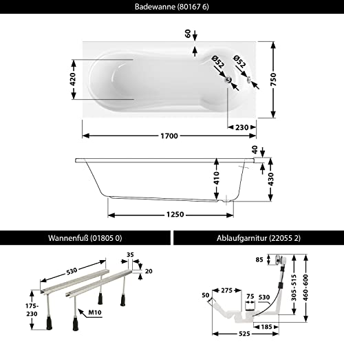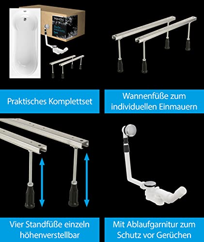➤ KOMPLETT-SET: Dieses Komplettset besteht aus einer Badewanne mit passender Excenter-Ablaufgarnitur mit Siphon sowie höhenverstellbaren Wannenfüßen. Alles ist ideal aufeinander abgestimmt.