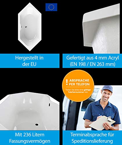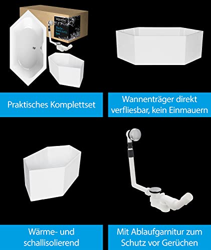 ➤ BADEWANNE KOMPLETTSET: • Badewanne scaLma • 6-eck Badewanne, Sonderform • Maßangaben: 190 x 90 cm • Fläche zum liegen: 124 cm • Füllmenge: 195 l • Wandstärke: 4 mm Acryl • Farbe: Weiß • Robust • Langlebig • Farbecht • Pflegeleicht • Excenter-Ablaufgarnitur • Überlaufschutz • Styropor-Wannenträger