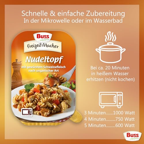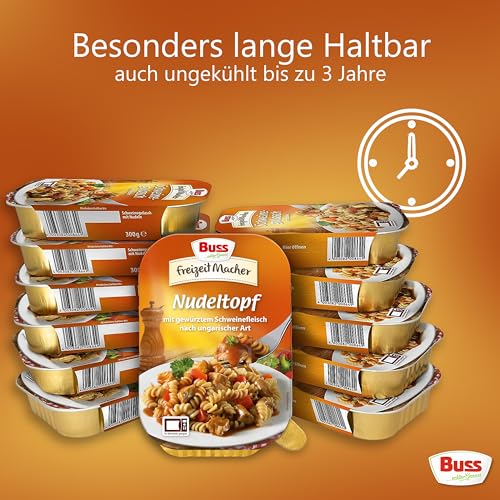 Buss Fertiggerichte – Freizeitmacher – Herzhaftes Gulasch vom Schwein mit Paprika und Nudeln – Fertiggericht für die Mikrowelle in Schalen – Lange haltbar – 12 x 300 g