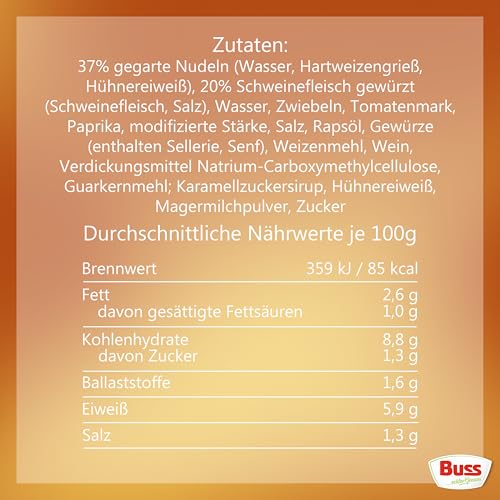 Zutaten: 37% gegarte Nudeln (Wasser, HARTWEIZENGRIEß, HÜHNEREIWEIß), 20% Schweinefleisch gewürzt (Schweinefleisch, Salz), Wasser, Zwiebeln, Tomatenmark, Paprika, modifizierte Stärke, Salz, Rapsöl, Gewürze (enthalten SELLERIE, SENF), WEIZENMEHL, Wein, Verdickungsmittel Natrium-Carboxymethylcellulose, Guarkernmehl; Karamellzuckersirup, HÜHNEREIWEIß, MAGERMILCHPULVER, Zucker.