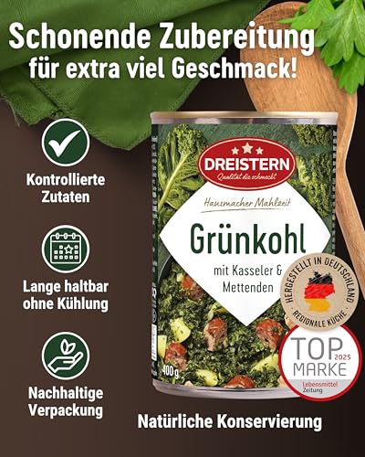 Appetit auf etwas Leckeres, aber keine Lust auf langes Kochen? Unser DREISTERN Grünkohl mit Kasseler & Mettenden ist die perfekte Lösung. In kurzer Zeit ein vollwertiges Gericht zaubern – das gelingt mit unseren Hausmacher Mahlzeiten mühelos. Ob für den Singlehaushalt oder die ganze Familie, unser Grünkohl passt sich jedem Bedarf an & bringt schnell eine köstliche Mahlzeit auf den Tisch. Hergestellt in Deutschland, aus kontrollierten, frischen Zutaten wie frischen Kartoffeln, Kasselerstücken und Mettenden, bietet es einen natürlichen, intensiven Geschmack. Die fein abgestimmte Kombination aus erlesenen Zutaten & aromatischen Gewürzen sorgt für ein schmackhaftes Geschmackserlebnis – ganz ohne zugesetzte Zusatzstoffe. Mit viel Einlage & schonender Zubereitung überzeugt unser Fleischgericht durch seine lange Haltbarkeit ohne Kühlung. Ob im Kochtopf oder in der Mikrowelle, das Fertiggericht ist in wenigen Minuten zubereitet & bereit zum Genießen. Perfekt für den Alltag, wenn es schnell gehen soll, ohne auf Qualität & Geschmack zu verzichten. DREISTERN steht seit vier Generationen für hausgemachte Qualität, die schmeckt. Unsere Produkte werden mit Liebe zubereitet, & wir legen großen Wert auf Nachhaltigkeit. Durch schonende Garprozesse bleiben Vitamine & Mineralstoffe erhalten, sodass Sie mit jeder Mahlzeit nicht nur Genuss, sondern auch einen Beitrag zu einer bewussten Ernährung leisten. DREISTERN – Qualität aus Tradition seit 1934. Probieren Sie unseren Grünkohl & erleben Sie den Unterschied: schneller Genuss, beste Zutaten & ein gutes Gefühl für Sie & die Umwelt!