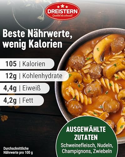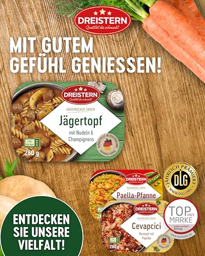 DREISTERN Jägertopf 280g I Mit Champignons & Nudeln I Herzhaftes Fertiggericht in Mikrowellenschale I Lange Haltbarkeit dank natürlicher Konservierung I Hausmacher Qualität