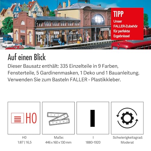FALLER Bahnhof Mittelstadt Modellbausatz mit 335 Einzelteilen 446 x 160 x 130 mm I Modelleisenbahn Zubehör H0 Gebäude I Modelleisenbahn H0 Bahnhof