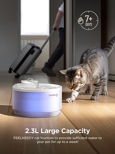 FEELNEEDY Katzenbrunnen für Katzen 2,3L Trinkbrunnen für Katze Leise, Wasserbrunnen Automatische, Eingebautes LED Licht, 3 Pack Filter, Durchsichtiger Wassertank Energiesparende Wasserpumpe, Weiß
