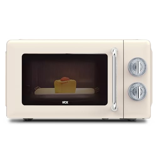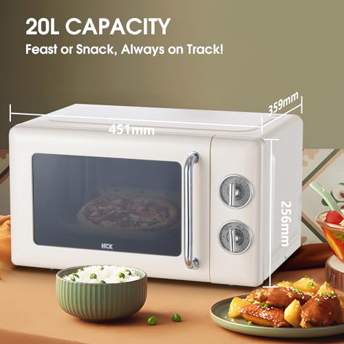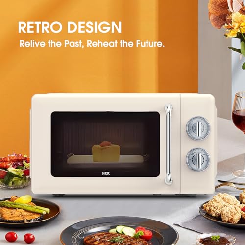 HCK Mikrowelle Retro, Mikrowellen 20L mit 700W Schnelle Heizung, Einfache Drehknopfbedienung, 6 Leistungsstufen inkl, Auftaufunktion, 360°Drehteller, Cremegelb