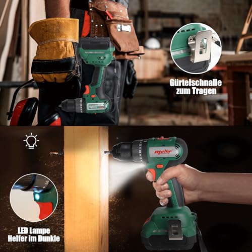 2-Gang-Getriebe & 20 Drehmomentstufen: Dank 2-Gang-Getriebe (400/ 1680 RPM) und 20 Drehmomentstufen ist Bohrschrauber sich geeignet für die verschiedene Arbeit. Sie können das Drehmoment je nach Dicke und Härte des Materials einstellen