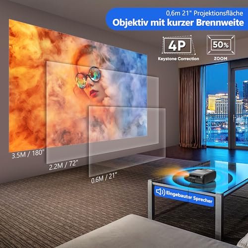 【Short-focal Lens & multiple correction methods & 50% zoom】Der tragbare Projektor verfügt über ein neues Lichtpfad-Design, das den minimalen Projektionsabstand von 5 Fuß auf 1,8 Fuß reduziert. Er unterstützt ±15°/4D/4P Trapezkorrektur, und mit der 4P Trapezkorrektur können alle 4 Ecken der Leinwand individuell eingestellt werden. Mit der Zoomfunktion können Sie die Leinwandgröße mit der Fernbedienung von 100 % bis 50 % einstellen, ohne den Projektor zu bewegen.