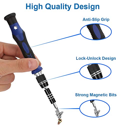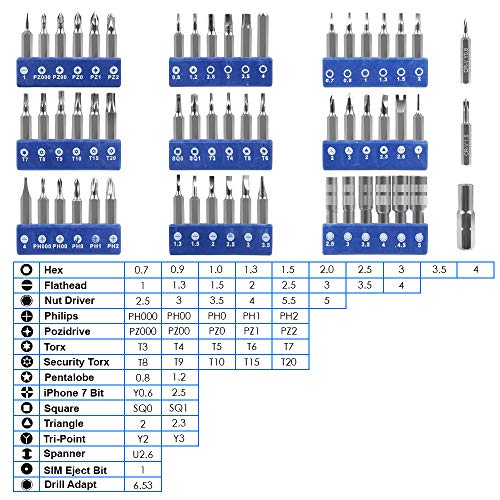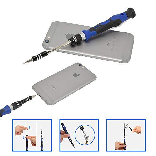 Werkzeug-Set MMOBIEL Schraubendreher Set mit magnetischen Schraubenzieher, Reparatur Werkzeug Kit. 60 in 1 mit 56 Bits präzisions Schraubendreher, flexibler Schaft – für alle Smartphone/MacBook/Tablet/PC/Elektronische Geräte. Diese magnetischen Handwerkzeuge gefertigt aus Chrom-Vanadium-Stahl zum reparieren von allen gängigen Laptops, Telefnonen, Spielkonsolen und anderen Elektronischen Geräten. Umfangreiches Set Inkl. Verlängerungs Verlängerungsstange und biegsamer Schaft Stange verlängert die Länge vom Griff welcher eine Grundlänge von 22,5 cm / 9 Inch hat. Die Verlängerung sowie der frei zu verbiegende Schaft helfen dabei auch Schrauben an schwer zugänglichen Stellen zu erreichen. Für iPad 2, 3, 4, 5, 6, Mini 1, 2 ,3 Air, 2 iPhone 4, 4S, SE, 5, 5C, 5S, 6, 6S, 7, 7 Plus, 8, 8 Plus, SE, X, XR, XS, XS Max / Asus ZenPad C 7.0, 8.0, S8.0 Z8S, 3S 10, Blackberry / BQ Aquaris Google Pixel, HTC M8, M9, M10, U11, U12 A9, Huawei P8, P8 Lite P9, P9 Lite, P9 Plus, P10, P10 Lite, P20, P20 Pro, P20Lite Enjoy 7S, P Smart, Mate 8, 9, Mate 10, 10 Lite, 20 Pro Nova, Nova 3i Honor 6, 7, 7C, 8, 8X, 9, 9 Lite, View 10 LG, G5, G5+, G6, G7 Stylus, Oneplus 3, 3T, 4, 5, 6 Nokia 5, 6, 7, 7Plus, 8, 9 Motorola Moto G4, G5, G5 G5S Plus, G6, G6 Play, E4, E5, X4, Play Samsung Galaxy, S4, LTE S5,, S6, S6 Edge, S7, S7 Edge S8, S8 Plus, S9, S9 Plus S10 XCover 3 XCover 4, A3, A5, A6, A7, A8, A9, Duos, J1, J2, J3, J4, J5, J6, J7, J8, J9 Note 2, 3, 4, 5, 8, 9 Samsung TAB T320, T530, Tab 4 T531,T535, T520, T820 P5100, P5200, P5210, Tab A, Tab E, Tab S2, TAB S3, S4 N8000 Wiko Lenny, Fever, Max, View Sony Xperia XA,XA1, XA2, XZ, XZ1, Z3, Z5, Xiaomi Mi A1, A2, A2Lite, Redmi Note, 3, 4, 5, S2, Y2 + Blu, Lenovo, Vivo V9, V11, V11i, V11 Pro Y53, Y83, Y71, Oppo A57, A73, F9 Find, X, Archos Garmin Sonim Sagem.