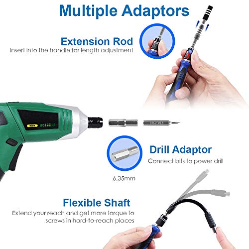 Umfangreiches Set Inkl. Verlängerungs Verlängerungsstange und biegsamer Schaft Stange verlängert die Länge vom Griff welcher eine Grundlänge von 22,5 cm / 9 Inch hat. Die Verlängerung sowie der frei zu verbiegende Schaft helfen dabei auch Schrauben an schwer zugänglichen Stellen zu erreichen.