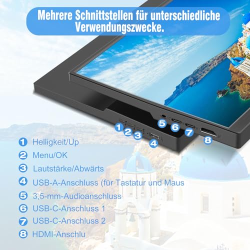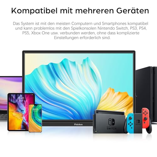 【USBC Portable Monitor】Mit zwei voll ausgestatteten USB-Typ-C-Anschlüssen, einem HDMI-Anschluss und USBA-Anschlüssen (zum Anschließen von Maus oder Tastatur) funktioniert der tragbare Monitor mit mehreren Geräten wie PC, Laptops, den meisten Smartphones, PS4, Xbox usw. Keine zusätzlichen Laufwerke erforderlich, einfach Plug-and-Play. Für die Strom- und Signalübertragung ist nur ein USB-Typ-C-Kabel erforderlich. Hinweis: Ihr Gerät sollte den USB-Typ-C-Anschluss der Version 3.1 unterstützen.