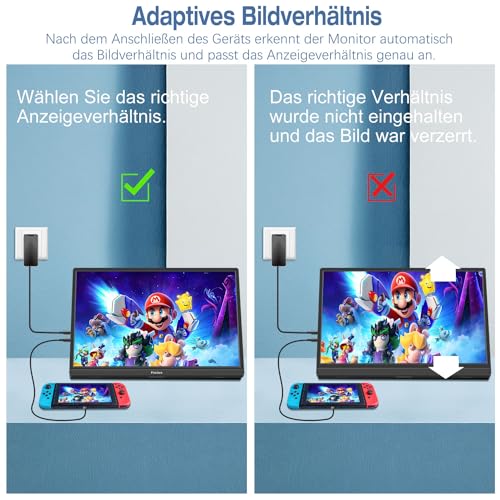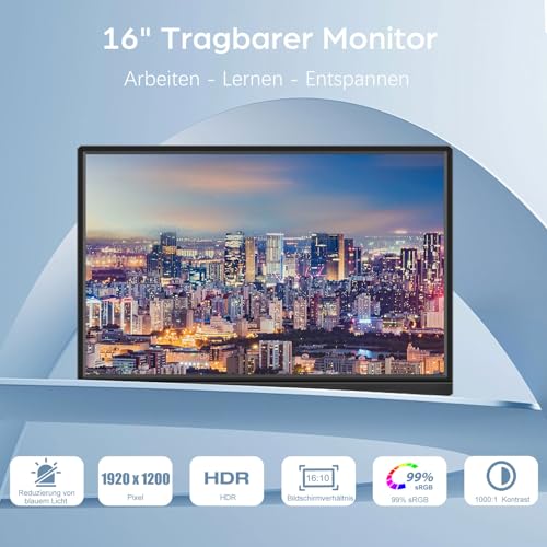 【Full HD Tragbarer Monitor】16 Zoll USBC Monitor verfügt über einen fortschrittlichen IPS-Bildschirm mit einer Auflösung von 1920 x 1200, 178° weitem Betrachtungswinkel, 100 % sRGB, unterstützt HDR, 16:10 goldenes Seitenverhältnis, Helligkeit 300 cd/m², gibt helle und präzise Farben wieder, liefert Klarer, flüssiger und hervorragende Leistung bei Spielen/Multimedia.