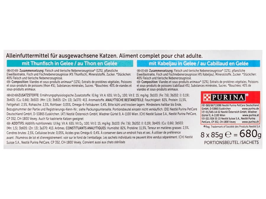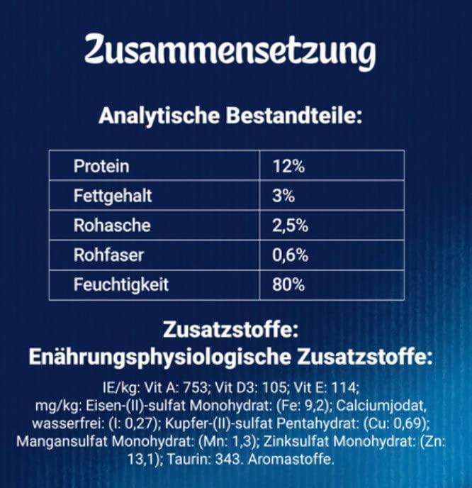 Eigenschaften Ohne Farbstoffe|Ohne Aromastoffe|Ohne Zusatz von Konservierungsstoffen Fütterungsempfehlung Fütterungsempfehlung: Füttere deiner ausgewachsenen Katze (4 kg) 3 Portionsbeutel pro Tag, die auf mind. 2 Mahlzeiten verteilt werden sollten. Diese Richtwerte basieren auf mäßig aktiven Katzen bei normaler Umgebungstemperatur. Individuelle Bedürfnisse können variieren, so dass die Futtermenge entsprechend angepasst werden sollte, um ein schlankes, gesundes Körpergewicht zu erhalten. Bitte zimmerwarm servieren. Sauberes, frisches Trinkwasser sollte stets zur Verfügung stehen. Fütterungsempfehlung: Füttere deiner ausgewachsenen Katze (4 kg) 4 Portionsbeutel pro Tag, die auf mind. 2 Mahlzeiten verteilt werden sollten. Diese Richtwerte basieren auf mäßig aktiven Katzen bei normaler Umgebungstemperatur. Individuelle Bedürfnisse können variieren, so dass die Futtermenge entsprechend angepasst werden sollte, um ein schlankes, gesundes Körpergewicht zu erhalten. Bitte zimmerwarm servieren. Sauberes, frisches Trinkwasser sollte stets zur Verfügung stehen. Fütterungsempfehlung: Füttere deiner a Analytische Bestandteile Analytische Bestandteile: Rind: Feuchtigkeit: 82%, Protein: 11,5%, Fettgehalt: 2,5%, Rohasche: 2,5%, Rohfaser: 0,05%, Omega-6-Fettsäuren: 0,4%. Kaninchen: Feuchtigkeit: 82%, Protein: 11,5%, Fettgehalt: 2,5%, Rohasche: 2,5%, Rohfaser: 0,05%, Omega-6-Fettsäuren: 0,4%. Lamm: Feuchtigkeit: 82%, Protein: 11,5%, Fettgehalt: 2,5%, Rohasche: 2,5%, Rohfaser: 0,05%, Omega-6-Fettsäuren: 0,4%. Huhn: Feuchtigkeit: 82%, Protein: 11,5%, Fettgehalt: 2,5%, Rohasche: 2,5%, Rohfaser: 0,05%, Omega-6-Fettsäuren: 0,4%. Zusammensetzung (Futter) Zusammensetzung: mit Rind: Fleisch und tierische Nebenerzeugnisse* (14%, davon 4% Rind), pflanzliche Eiweißextrakte, Fisch und Fischnebenerzeugnisse, Mineralstoffe, Zucker. *Stückchen: 44% Fleisch und tierische Nebenerzeugnisse. mit Lamm: Fleisch und tierische Nebenerzeugnisse* (14%, davon 4% Lamm), pflanzliche Eiweißextrakte, Fisch und Fischnebenerzeugnisse, Mineralstoffe, Zucker. *Stückchen: 44% Fleisch und tierische Nebenerzeugnisse. mit Kaninchen: Fleisch und tierische Nebenerzeugnisse* (14%, davon 4% Kaninchen), pflanzliche Eiweißextrakte, Fisch und Fischnebenerzeugnisse, Mineralstoffe, Zucker. *Stückchen: 44% Fleisch und tierische Nebenerzeugnisse. mit Huhn: Fleisch und tierische Nebenerzeugnisse* (14%, davon 8% Huhn), pflanzliche Eiweißextrakte, Fisch und Fischnebenerzeugnisse, Mineralstoffe, Zucker. *Stückchen: 44% Fleisch und tierische Nebenerzeugnisse. Zusatzstoffe (Futter) Zusatzstoffe: mit Rind: Ernährungsphysiologische Zusatzstoffe: IE/kg: Vit A: 655; Vit D3: 100; Vit E: 15; mg/kg: Eisen-(II)-sulfat Monohydrat: (Fe: 7,6); Calciumjodat, wasserfrei: (I: 0,19); Kupfer-(II)-sulfat Pentahydrat: (Cu: 0,66); Mangansulfat Monohydrat: (Mn: 1,5); Zinksulfat Monohydrat: (Zn: 13); Taurin: 413. Aromastoffe. mit Kaninchen: Ernährungsphysiologische Zusatzstoffe: IE/kg: Vit A: 655; Vit D3: 100; Vit E: 15; mg/kg: Eisen-(II)-sulfat Monohydrat: (Fe: 7,6); Calciumjodat, wasserfrei: (I: 0,19); Kupfer-(II)-sulfat Pentahydrat: (Cu: 0,66); Mangansulfat Monohydrat: (Mn: 1,5); Zinksulfat Monohydrat: (Zn: 13); Taurin: 413. Aromastoffe. mit Lamm: Ernährungsphysiologische Zusatzstoffe: IE/kg: Vit A: 655; Vit D3: 100; Vit E: 15; mg/kg: Eisen-(II)-sulfat Monohydrat: (Fe: 7,6); Calciumjodat, wasserfrei: (I: 0,19); Kupfer-(II)-sulfat Pentahydrat: (Cu: 0,66); Mangansulfat Monohydrat: (Mn: 1,5); Zinksulfat Monohydrat: (Zn: 13); Taurin: 413. Aromastoffe. mit Huhn: Ernährungsphysiologisch Produkttyp Nassfutter Tierart Katze Futtermittelart Alleinfutter Hersteller Nestlé Purina PetCare Deutschland GmbH Herstelleradresse D-53865 Euskirchen Kontaktmöglichkeit www.purina.de Zulassungsnummer 02 23 83 02 Tierart Katze Verpackungsart Beutel Inhalt 1020 g