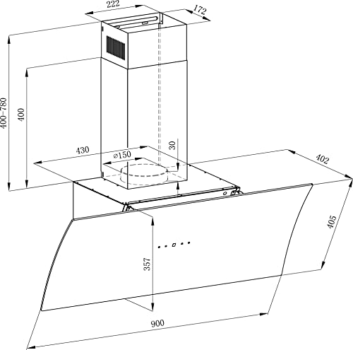 MONTAGE: Die Abzugshaube ist kopffrei und lässt sich leicht an der Wand montieren. Mit dem 135 cm langem Kabel und dem Anschluss von 150 cm für den Abluftbetrieb, lässt sich diese einfach in Betrieb nehmen