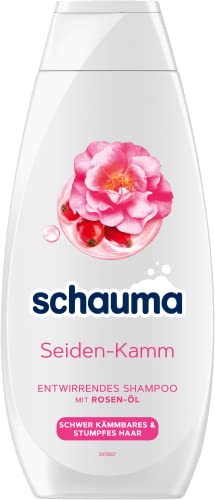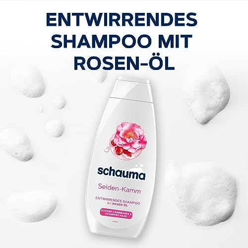 Schauma Shampoo Seiden-Kamm mit Rosen-Öl – Pflegt und entwirrt auch ohne Spülung Das Schauma Shampoo Seiden-Kamm mit Rosen-Öl ist auf die Bedürfnisse von schwer kämmbarem & stumpfem Haar abgestimmt. Es pflegt und entwirrt auch ohne zusätzliche Spülung. Gleichzeitig glättet es die Haaroberfläche – für leicht kämmbares und seidig-glänzendes Haar. Die Formel ist vegan*.Die Shampooflasche besteht zu 50 Prozent aus recyceltem Plastik**, während der Verschluss bereits zu 25 Prozent aus recyceltem Plastik besteht. Be smart.