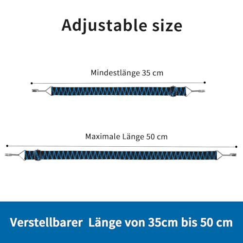 Spanngurt 50cm hat eine hohe Elastizität, Alterungsbeständigkeit und Reißfestigkeit.Gummiseil flach kann als Sturmband für Vorzelt, als Gepäckträger Spanngurt und als Planenspanner verwendet werden.Doppelhaken aus Metall sind rostfrei und stark.