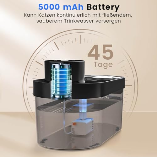 【Kontinuierlicher Wasserfluss für Katzen】 Trinkbrunnen für Katze Kabellos verfügt über einen eingebauten 5000-mAh-Lithium-Akku (nicht austauschbar, wiederaufladbar über Typ-C-Anschluss). Bei voller Ladung kann der Akku im Induktionsmodus bis zu 45 Tage lang betrieben werden. Da er nicht an Steckdosen gebunden ist, müssen Sie sich keine Sorgen über versehentliche Stromausfälle machen, und er kann Katzen kontinuierlich mit fließendem, sauberem Trinkwasser versorgen.