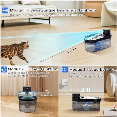 【Katzenbrunnen mit Bewegungsmelder】 Unser Wasserbrunnen für Katzen verfügt über 3 Betriebsmodi: 1. Bewegung: beginnt zu arbeiten, wenn eine Bewegung erkannt wird 2. Timer: d.h. Wasser fließt alle 15 Minuten für 20 Sekunden in einem Zyklus aus 3. Dauerbetrieb (funktioniert nur, wenn der Netzstecker eingesteckt ist). Der Bewegungsmodus regt das Interesse der Katze am Wassertrinken stark an.
