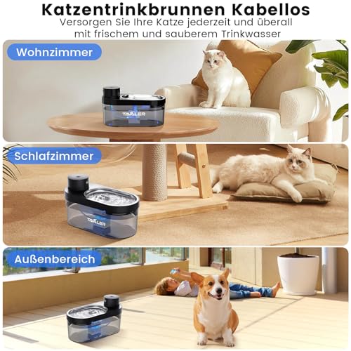 【Katzenbrunnen Kabellos】 Tavaler Katzen Trinkbrunnen mit Sensor bietet Ihnen den Komfort eines kabellosen Systems, ohne dass Sie sich Sorgen machen müssen, dass Ihre Katze die Kabel beschädigt oder die Gefahr eines elektrischen Lecks besteht. Er kann am Lieblingsplatz Ihrer Katze aufgestellt werden, z. B. im Wohnzimmer, Schlafzimmer, in der Küche, im Badezimmer, im Freien usw. Versorgen Sie Ihre Katze jederzeit und überall mit frischem und sauberem Trinkwasser.