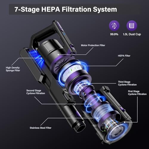 7-Stufen-HEPA-Filtersystem: Der kabellose Stabsauger hat ein 7-stufiges fortschrittliches Filtersystem, das 99,9% des Feinstaubs auffängt. Der 1,3 L Staubbehälter reduziert die Häufigkeit der Entleerung und schließt die Reinigung schneller ab. HEPA ist waschbar und recycelbar.