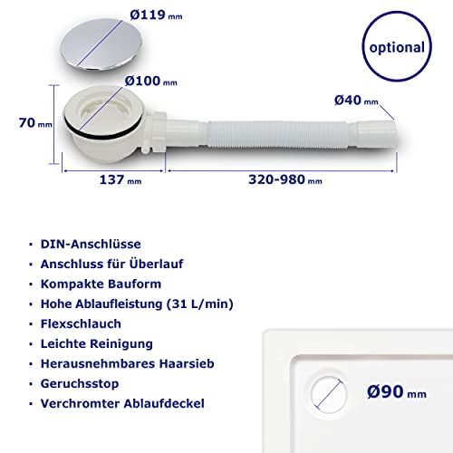 Siphon opt., Flexschlauch, Haarsieb, Geruchsstop, Verchromter Ablaufdeckel