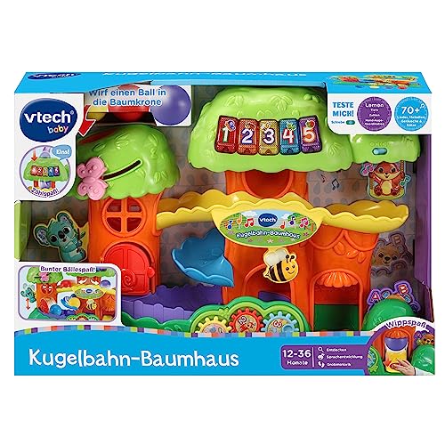 Lieferumfang: 1 x VTech Baby Kugelbahn-Baumhaus / Kindersicheres Batteriefach und Abschaltautomatik / Deutsche Version / Alter: 12-36 Monate / 2 x AA/LR6 Demobatterien / Art. Nr.: 80-564904