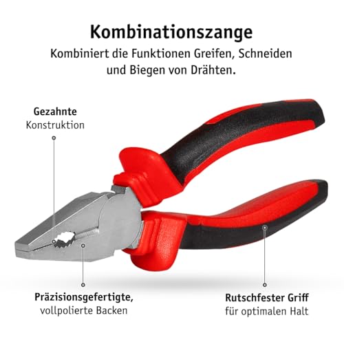 Kombinationszange (160 mm):Die Kombinationszange mit einer Länge von 160 mm vereint Schneid- und Greifmöglichkeiten in einem Werkzeug. Sie ist perfekt für vielseitige Aufgaben geeignet, sei es das Schneiden von Drähten oder das Greifen von Materialien unterschiedlicher Art.