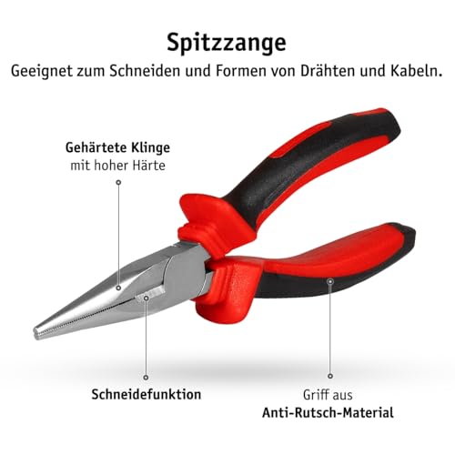 Spitzzange (160 mm):Die Spitzzange mit einer Länge von 160 mm ist ideal für präzises Greifen, Halten und Biegen von Drähten und kleinen Werkstücken. Die schlanken, spitz zulaufenden Backen ermöglichen einen exakten Zugriff auch in schwer zugänglichen Bereichen.