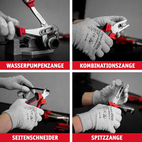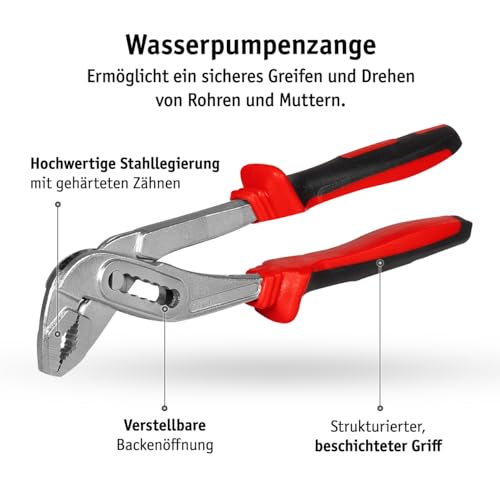Wasserpumpenzange (250 mm):Die Wasserpumpenzange mit einer Länge von 250 mm ist ein wahres Multitalent. Mit ihrer verstellbaren Backenöffnung eignet sie sich hervorragend zum Greifen und Festhalten von unterschiedlichsten Materialien. Die Zange bietet eine ausgezeichnete Hebelwirkung und ermöglicht so ein müheloses Arbeiten.