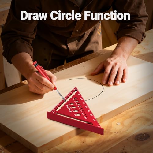 【180mm Rotes Multifunktions Dreieckslineal】Der 180mm Metrische Anschlagwinkel aus Aluminiumlegierung kann 90°-Winkel, vertikale Linien, horizontale Linien und Bohrlochpositionierungen anreißen. Die Bohrpositionierungs-Funktion ermöglicht eine Positionierung, die an verschiedene Bohrgößen angepasst werden kann.